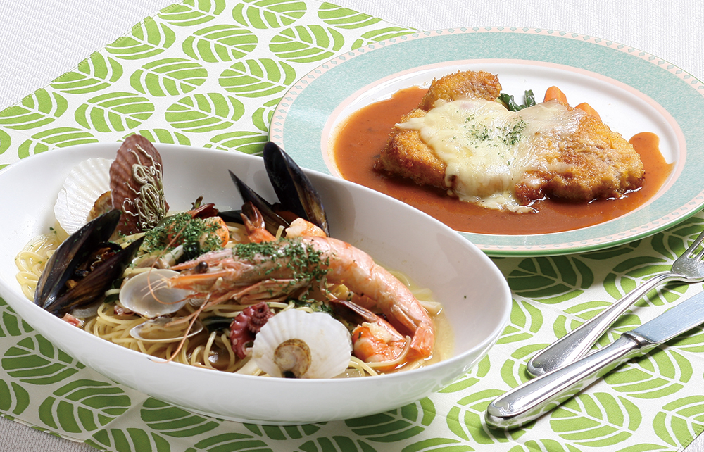 海の恋人スパゲティ(シーフード)と英国 風ポークカツレツ。