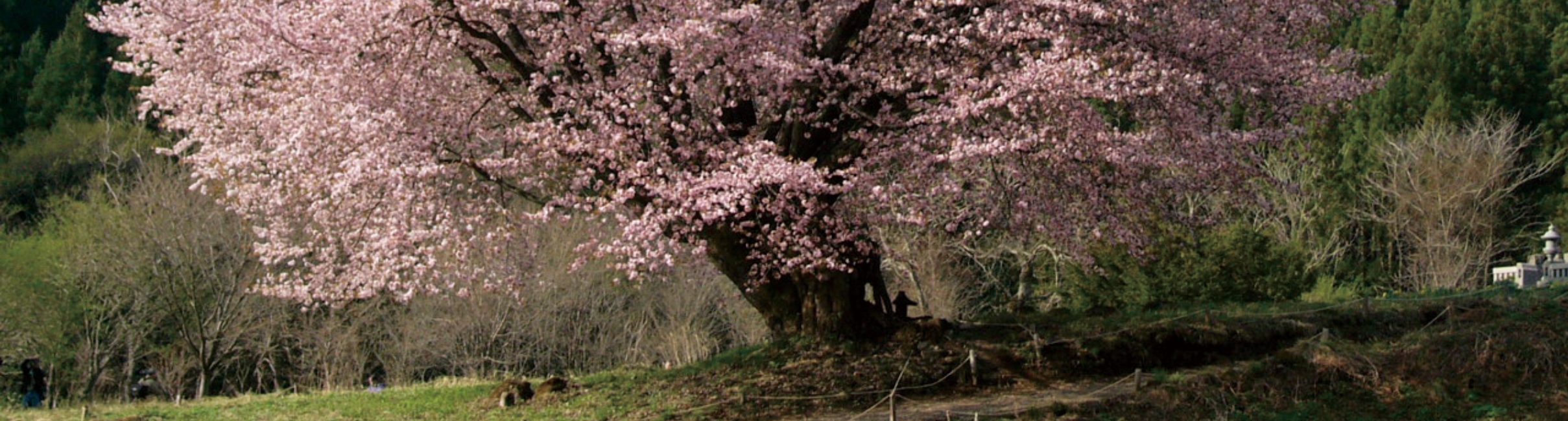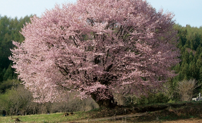 春群馬県の天然記念物で、幹回り6m、枝幅17m を超える推定樹齢300 年以上の大きな一本桜。根元に天...